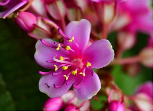 虎颜花属于野牡丹科虎颜花属,多年生常绿草本,茎极短,被红色粗硬毛,具粗短的根状茎,略木质化;叶基生,叶片膜质,心形,顶端近圆形,边缘具细齿,基部心形,长宽20-30厘米或更大,叶面无毛,叶背被红色绒毛;叶柄圆柱形,肉质,被红色粗硬毛;蝎尾状聚伞花序腋生,花瓣5,暗红色,蒴果漏斗状杯形,花期约11月下旬,果期3-5月。 虎颜花喜高温 、湿润的半阴环境,耐寒性较强,忌阳光直射。生长温度为17-30℃,在5℃以上能安全越冬,能耐短时0℃低温。在夏季栽培管理时特别注意遮阳,遮光率需达到50%-70%,否则叶片易发黄。冬季应在温室栽培,或采取其他保温措施 。