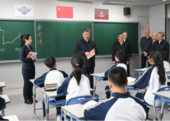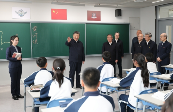 北京市援建的北京四中雄安校区2023年8月投入使用,现有学生380多人。教学楼里,学生们正在上课。习近平走进初一(2)班教室,同师生交谈,了解教学情况。他希望把北京四中办学的好经验好做法带过来,用心用情呵护孩子们身心健康,促进孩子们全面发展。
