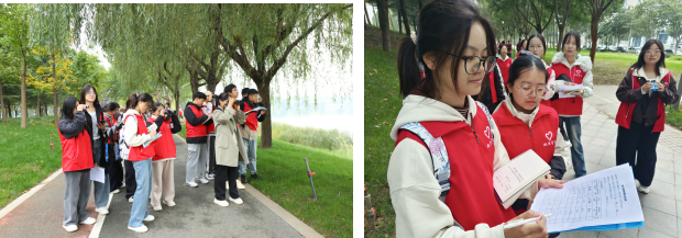 观鸟过程中,讲解员逐一介绍不同生境中容易观察到的鸟类。大家听后热情高涨,同学们纷纷举起望远镜仔细观察着各种鸟类的细节特征,同时做好笔记。通过观察,大家基本了解了小䴙䴘、凤头䴙䴘、黑水鸡、白骨顶、黑眉苇莺、珠颈斑鸠、喜鹊、白头鹎、黄眉柳莺、棕背伯劳等一系列野生鸟类的形态特征及栖息环境,对野生鸟类保护的重要性表示认可。