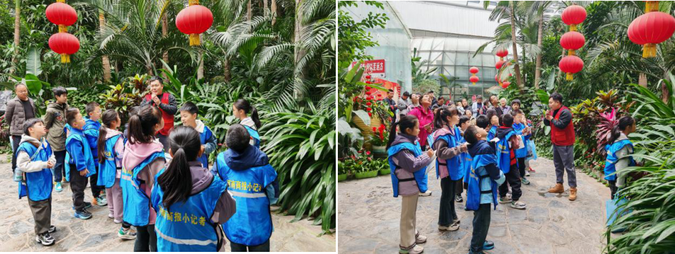 在科普志愿者的带领下,小记者们参观了展览温室特色植物展区。重点介绍展览温室代表植物,如亚热带、热带特色植物油棕、高山榕等,详细讲解热带雨林的五大奇观;生动讲述植物相关的人文故事,如咖啡历史文化,猴面包树名称由来,见血封喉民间传说等,将自然科学与人文知识相融合。活动过程中,小记者们踊跃提问,认真记录,现场氛围热烈。
