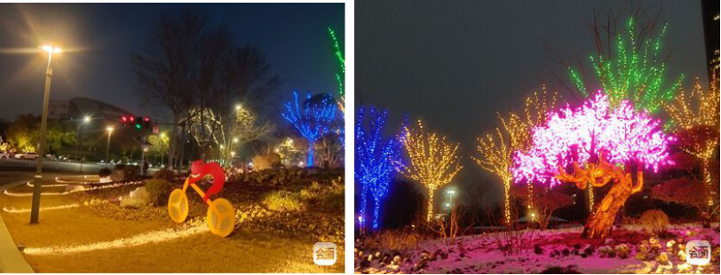 在嵩山路与中原路交叉口的绿城广场西北角,“绿动新春·健康启程”主题花境营造出别样的迎春氛围。该景观以回收木板打造的自行车装置为核心,由广场干部职工亲手完成,诠释了“变废为宝、以旧焕新”的绿色理念。景观照明系统设置树形灯具、投射灯和星星串灯,营造出温馨明亮的夜间效果,传递绿色健康的生活理念。